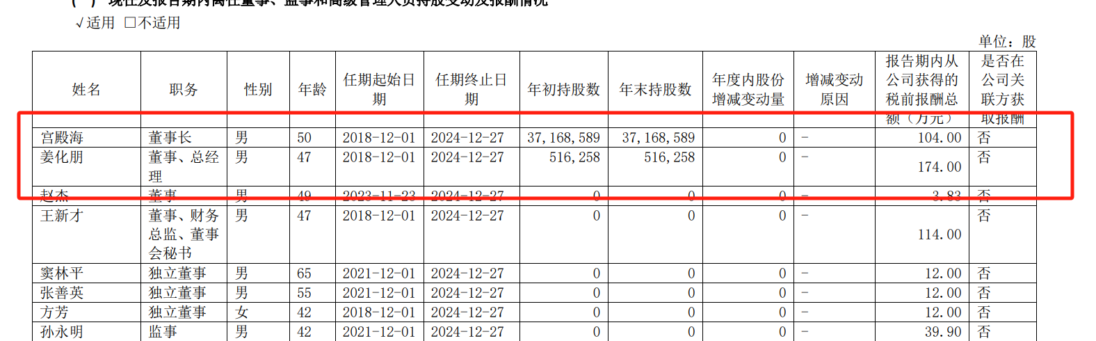 据查阅,宫殿海2023年从公司获得的税前报酬总额104万元,董事、总经理姜化朋为174万元。