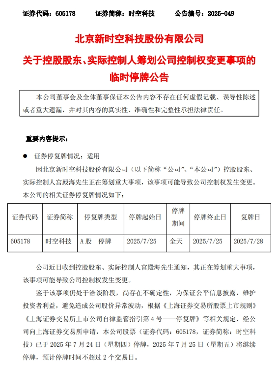 7月24日晚,时空科技(605178)公告称,公司收到控股股东、实际控制人宫殿海通知,其正在筹划重大事项,该事项可能导致公司控制权发生变更。公司股票已于7月24日停牌,预计停牌时间不超过2个交易日。
