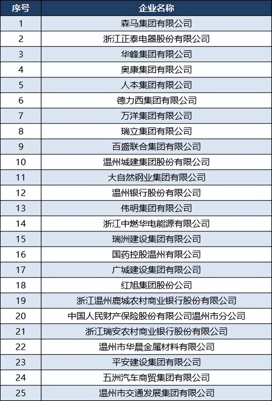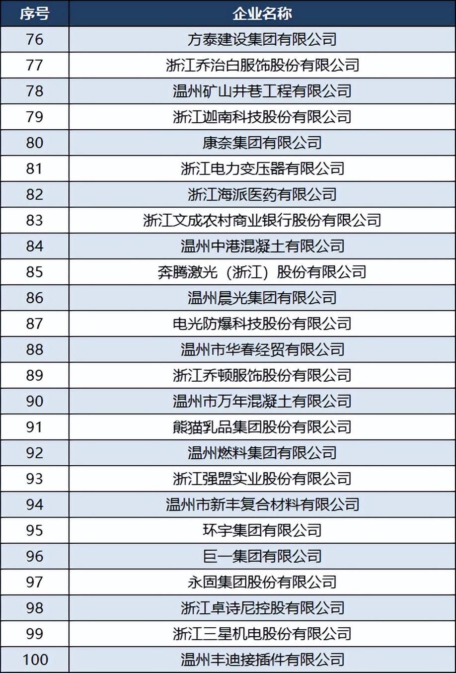 2022温州企业100强排名前十的企业为:森马集团、正泰电器、华峰集团、奥康集团、人本集团、德力西集团、万洋集团、瑞立集团、百盛联合集团、温州城建集团。