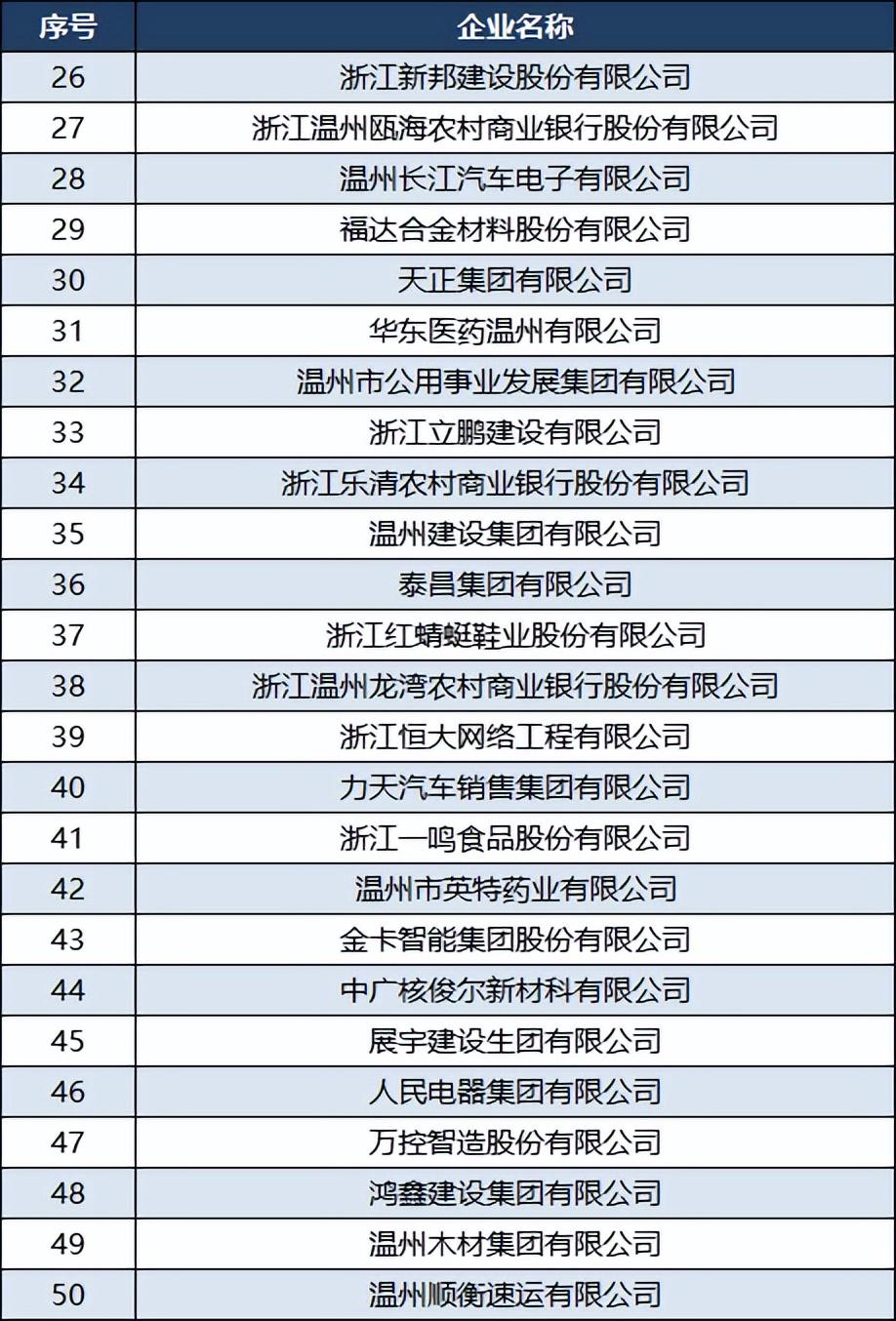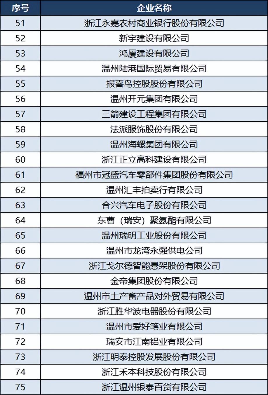 温州木材集团有限公司排名第49位,温州顺衡速运有限公司排名第50位;