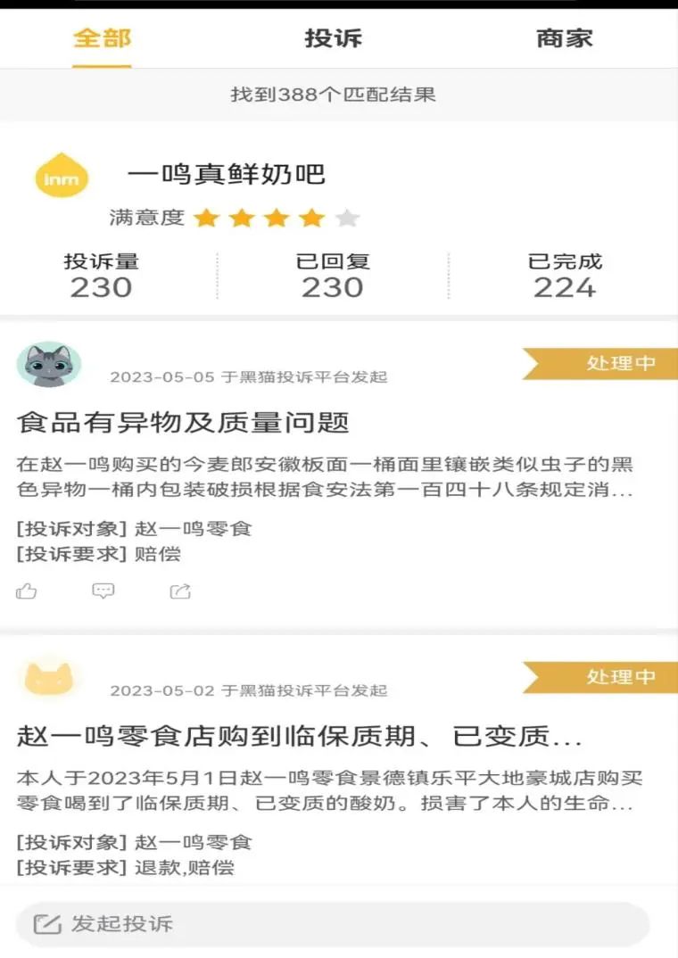 浏览黑猫投诉,截止2023年5月18日22时,一鸣食品共有230条投诉。仍不乏产品有异物、变质、服务不佳等质疑。