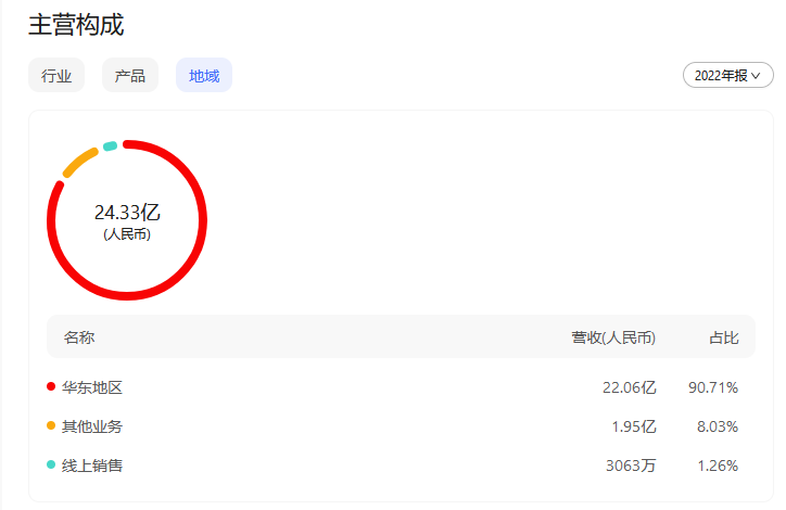 2019年—2021年,浙江省营收16.14亿元、16.06亿元和18.06亿元,营收占比达80.82%、82.49%和77.98%。2022年财报甚至不再显示具体省份,营收直接划分为华东地区和线上销售两大部分。其中华东营收22.06亿元,营收占比达90.67%。如此集中依赖,以至被一些舆论戏称“包邮区”专供奶。