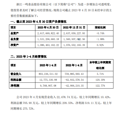 2023年1-4月,一鸣食品的营业收入和净利润分别为8.03亿元和976.89万元,与上年同期的7.6亿元和-4290.62万元相比,增幅分别为5.71%和122.77%。