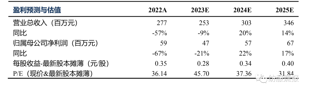 考虑22年业绩低于预期,我们将23-24年净利预测2.3/2.7亿下调至0.5/0.6亿、增加25年预测值0.7亿,对应23-25年PE为46/37/32X,估值较高,下调至“中性”评级。