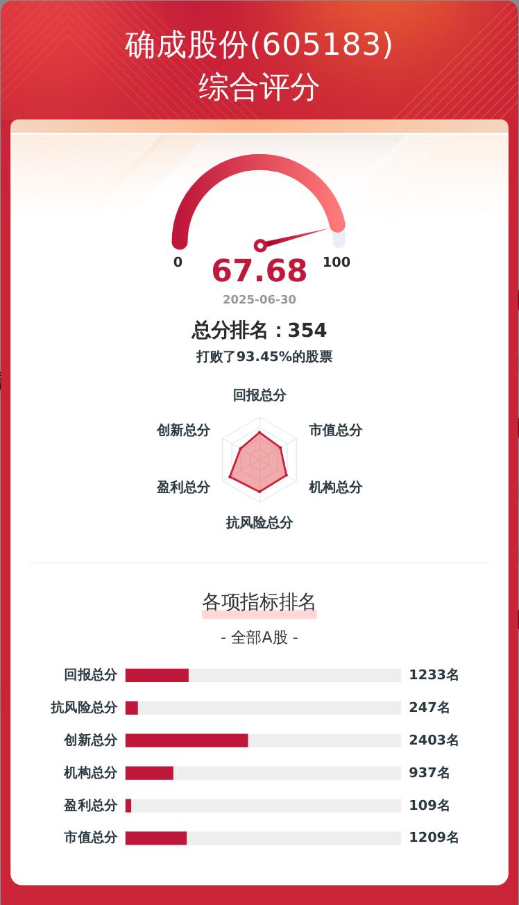 金融界上市公司研究院构建了一套上市公司韧性评价体系,从企业盈利、科技创新、股东回报、经营抗风险、市值表现及机构吸引力六个维度对企业进行量化评分,满分为100分。确成股份的韧性评价总分为67.68分,在A股5405家可比上市公司中排名第354位。