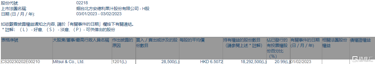 根据联交所最新权益披露资料显示,2023年2月1日,安德利果汁(02218.HK)遭Mitsui & Co., Ltd.在场内以每股均价6.5072港元减持2.85万股,涉资约18.55万港元。