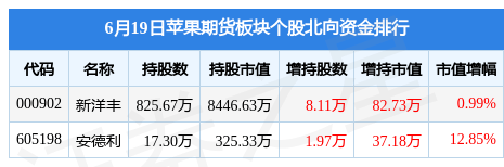 北向资金方面,当日苹果期货板块北向资金持股市值为0.88亿元,增持119.91万元。其中增持最多的是新洋丰,增持了82.73万元。苹果期货板块北向资金持股变动明细见下表: