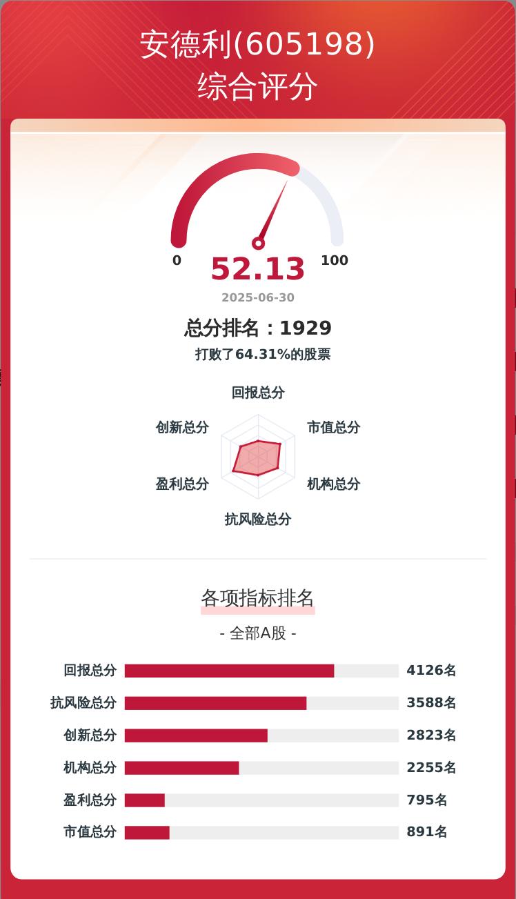上市公司研究院构建了一套上市公司韧性评价体系,从企业盈利、科技创新、股东回报、经营抗风险、市值表现及机构吸引力六个维度对企业进行量化评分,满分为100分。安德利的韧性评价总分为52.13分,在A股5405家可比上市公司中排名第1929位。