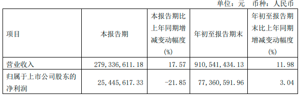 10月28日,葫芦娃(SH605199)公告,第三季度营业收入约2.79亿元,比上年同期增加17.57%,归属于上市公司股东的净利润约2544.56万元,比上年同期减少21.85%,归属于上市公司股东的扣除非经常性损益的净利润约2472.5万元,,比上年同期增加191.79%,基本每股收益0.06元/股,比上年同期减少25%,总资产约14.78亿元,比上年同期减少2.81%。