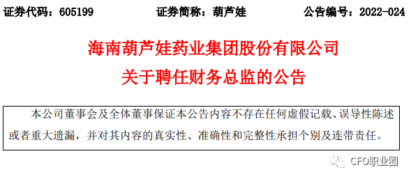 海南葫芦娃药业集团股份有限公司(以下简称“公司”)于2022年7月8日召开第二届董事会2022年第三次临时会议,审议通过了《关于聘任财务总监的议案》,同意聘任于汇女士(个人简历附后)为公司财务总监,任期与本届董事会任期一致。