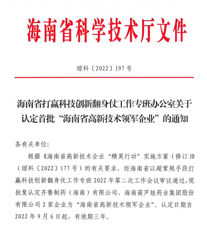 近日,海南省科学技术厅发布的《海南省打赢科技创新翻身仗工作专班办公室关于认定首批“海南省高新技术领军企业”的通知》中显示,批复认定海南葫芦娃药业集团股份有限公司等2家企业为“海南省高新技术领军企业”。认定日期自2022年9月6日起,有效期三年。