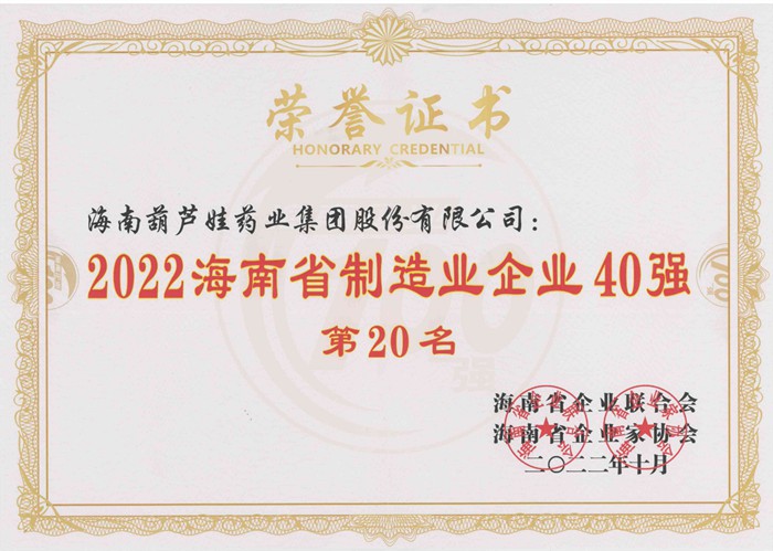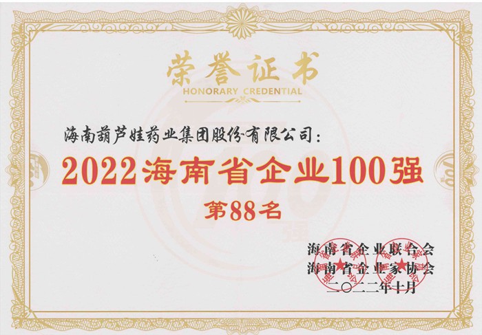11月8日,海南省企业联合会、海南省企业家协会联合发布了2022年海南省企业100强、制造业企业40强和服务业企业50强榜单。葫芦娃药业荣获2022“海南省企业100强”第88位和“海南省制造业企业40强”第20位,这也是该公司连续三年获此殊荣。