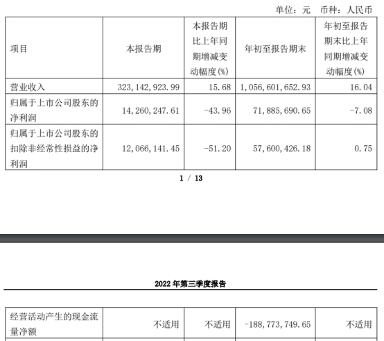 葫芦娃于2022年10月28日披露《2022年第三季度报告》显示,2022年前三季度,公司实现营业收入1,056,601,652.93元,同比增长16.04%;归属于上市公司股东的净利润71,885,690.65元,同比下降7.08%;归属于上市公司股东的扣除非经常性损益的净利润57,600,426.18元,同比增长0.75%;经营活动产生的现金流量净额为-188,773,749.65元。
