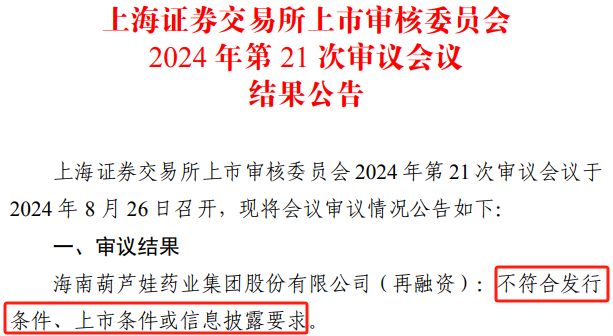 上交所上市审核委员会2024年第21次审议会议于8月26日召开,会议审议结果显示,海南葫芦娃药业集团股份有限公司(再融资)“不符合发行条件、上市条件或信息披露要求”。
