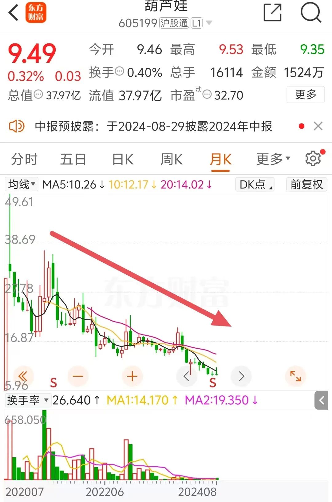 葫芦娃的股价在上市之初经历过一轮爆炒,之后持续进入下降通道至今,截至8月26日收盘,公司最新市值约为38亿元。截至今年一季度末,公司有股东3.24万户。