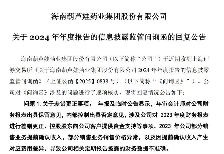 此外,交易所还对ST葫芦娃2024 年年度报告的信息披露发出监管问询函(以下简称“问询函”)。2025年7月5日,ST葫芦娃对问询函中的相关问题作出回复。