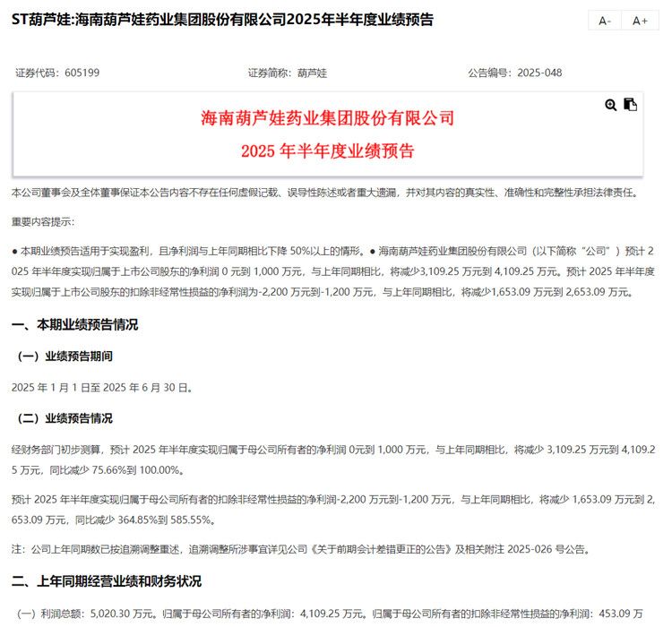 近期,ST葫芦娃发布的业绩预告显示,2025年上半年,公司预计归母净利润同比减少75.66%至100%。此外,公司被会所出具保留意见审计报告和否定意见内部控制审计报告备受关注。