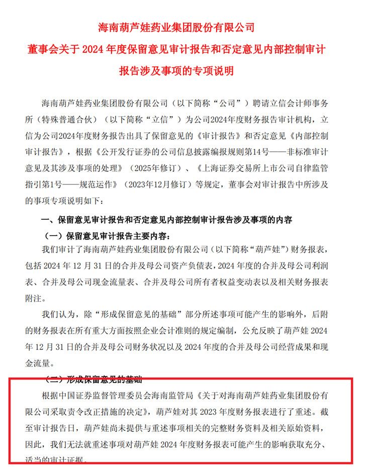 形成保留意见的基础显示,根据中国证券监督管理委员会海南监管局《关于对海南葫芦娃药业集团股份有限公司采取责令改正措施的决定》,ST葫芦娃对其2023年度财务报表进行了重述。截至审计报告日,ST葫芦娃尚未提供与重述事项相关的完整财务资料及相关原始资料。因此,立信无法就重述事项对ST葫芦娃 2024 年度财务报表可能产生的影响获取充分、适当的审计证据。