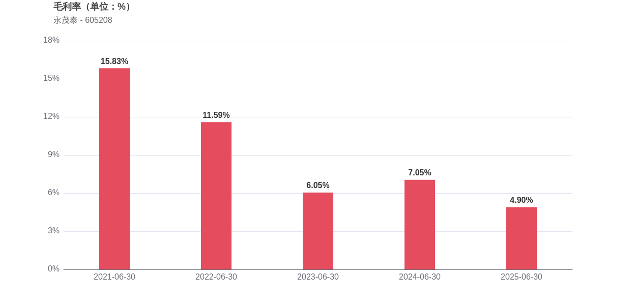 从反映盈利质量的指标来看,永茂泰各项盈利指标均出现明显下滑。净利率从2024年上半年的2.05%降至0.75%,毛利率从7.05%降至4.90%,净资产收益率为0.93%,同比下降0.75个百分点,显示公司盈利质量有所恶化。