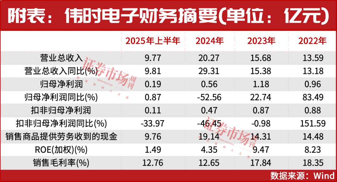 伟时电子《募集说明书(注册稿)》中披露,2022年到2025年上半年,公司营业收入分别为135873.46万元、156777.10万元、202734.76万元以及97664.42万元;净利润分别为9614.41万元、11800.47万元、5598.41万元以及1948.08万元;扣非归母净利润分别为8775.23万元、8688.90万元、4653.13万元以及1094.19万元。“2024年,虽然公司营业收入实现较快增长,但受客户结构调整、市场竞争加剧等影响,公司本期毛利率水平明显下降,进而导致2024年公司扣除非经常性损益后的净利润出现较大程度下滑;2025年1-6月,营业收入同比上升、毛利率企稳,但毛利额的增长未能充分抵消期间费用的增长,导致扣除非经常性损益后的净利润较同期有所下滑。若未来影响公司业绩的因素无法得到改善,则公司经营业绩将存在大幅下滑的风险。”