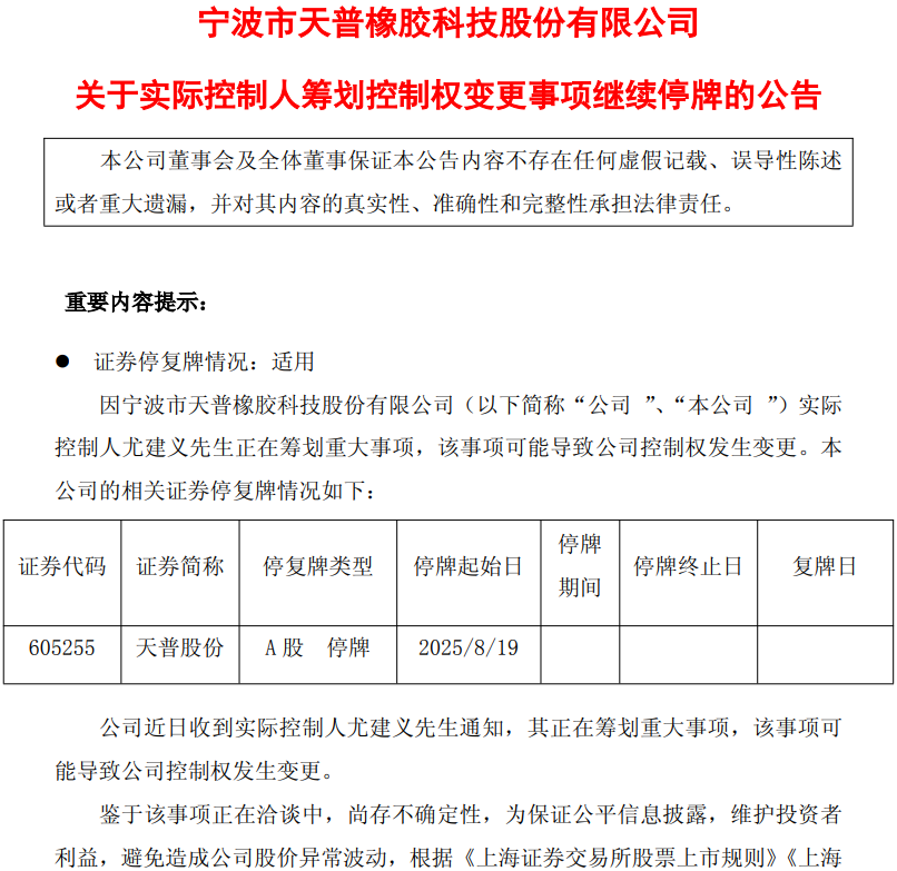 8月19日,天普股份(605255)发布公告称,因实际控制人尤建义正在筹划重大事项,该事项可能导致公司控制权发生变更,因此公司股票将继续停牌。