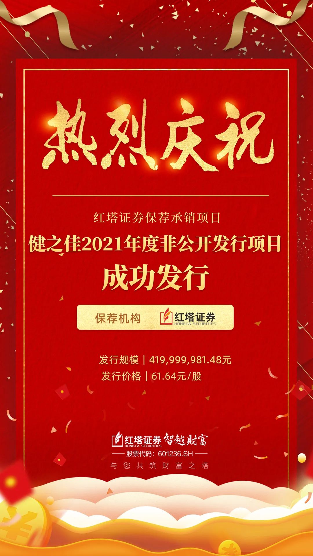 继2020年12月成功保荐健之佳完成首次公开发行股票并上市后,红塔证券股份有限公司(以下简称“红塔证券”)根据双方达成的战略合作协议,继续深化与健之佳的战略合作关系,2021年继续对健之佳非公开发行股票事项进行保荐承销。本次健之佳非公开发行过程中,红塔证券践行“投行+投资”协同联动的综合金融服务理念,强化公司内部轻重资本业务协同推进,从方案设计、发行审核、融资安排到实施落地,全流程主导推进,确保健之佳本次非公开发行最终成功发行,助力健之佳稳健快速发展。