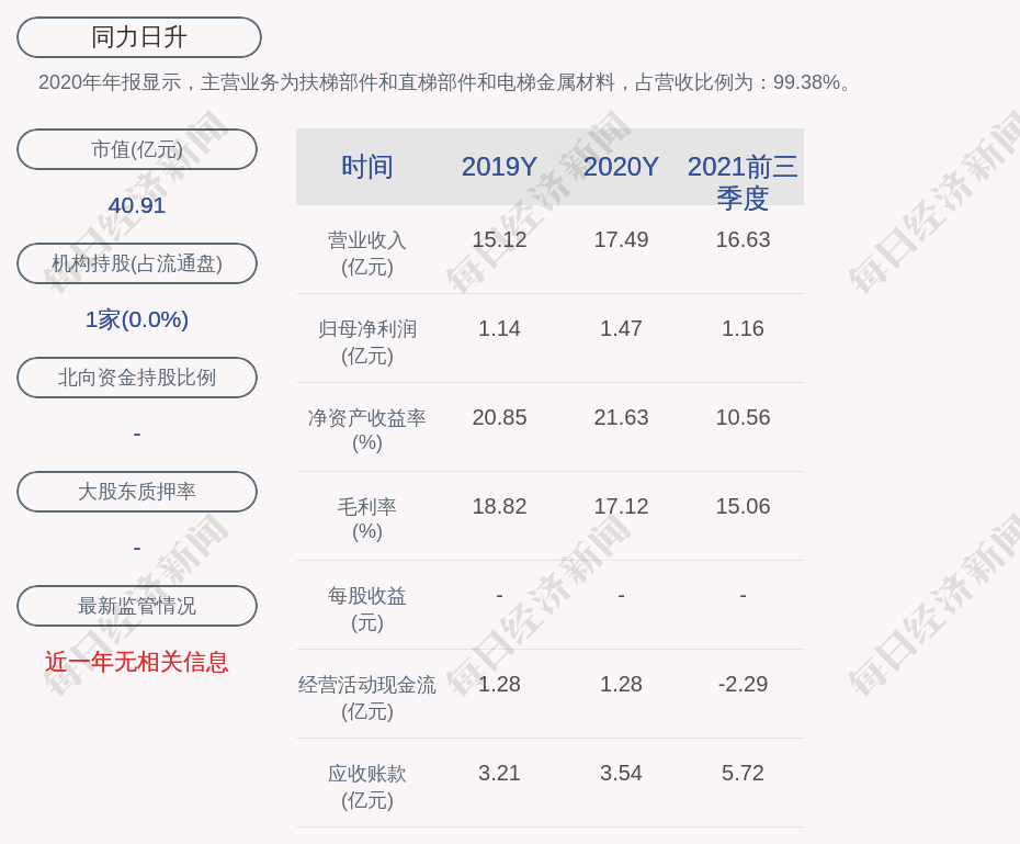2020年年报显示,同力日升的主营业务为扶梯部件和直梯部件和电梯金属材料,占营收比例为:99.38%。