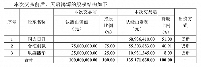 3月19日,同力日升披露公司打算通过支付现金的方式以2.4亿元收购北京天启鸿源新能源科技有限公司(下称天启鸿源)33.76%的股权(增资前股权比例,对应出资额为33,764,772元),并参考江苏天健华辰资产评估有限公司出具的资产评估报告所载评估值,以协商后标的整体交易作价7.108亿元,对天启鸿源增资2.5亿元。此次股权转让及增资完成后,同力日升将合计持有天启鸿源51%的股权(对应出资额为68,936,410元),天启鸿源即成为公司控股子公司。