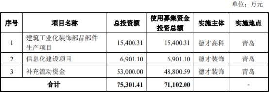 德才股份6月23日披露的招股书显示,公司拟募集资金7.11亿元,分别用于建筑工业化装饰部品部件生产项目、信息化建设项目、补充流动资金。
