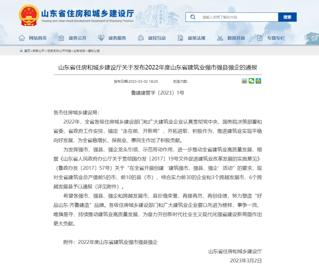 近日,山东省住房和城乡建设厅下发《关于发布2022年度山东省建筑业强市强县强企的通报》,德才股份连续荣获山东省建筑业综合实力30强企业。山东省建筑业综合实力30强企业评选排名是山东省住建厅根据《山东省人民政府办公厅关于贯彻国办发〔2017〕19号文件促进建筑业改革发展的实施意见》要求,以提升建筑业规模总量、质量效益、发展潜能、品牌价值为目标,鼓励建筑企业进一步推动全省建筑业高质量发展,引导企业上档升级,支持企业做强做大,在综合考虑建筑企业规模和效益的基础上,测算得出的排名,客观反映了全省建筑企业在行业中的综合竞争实力。