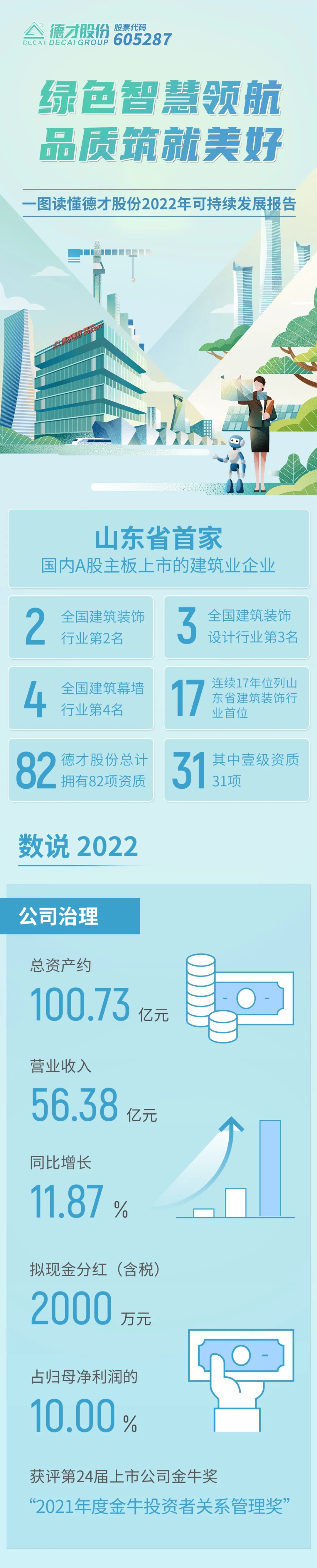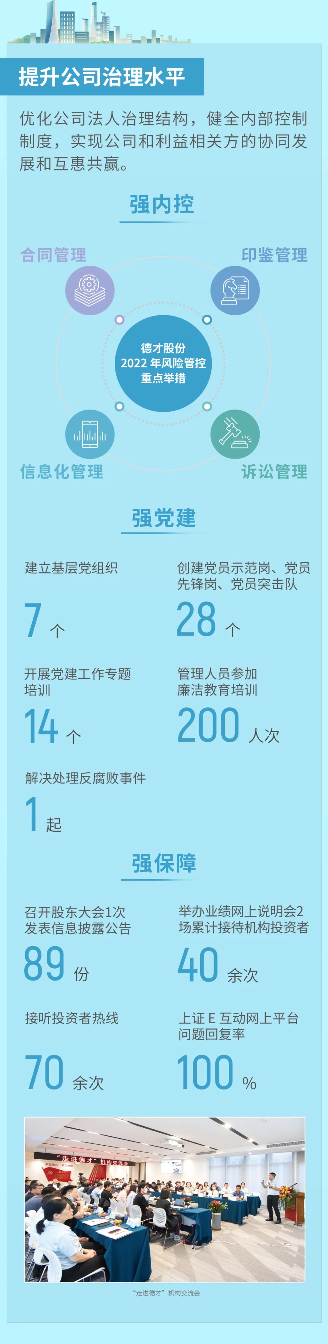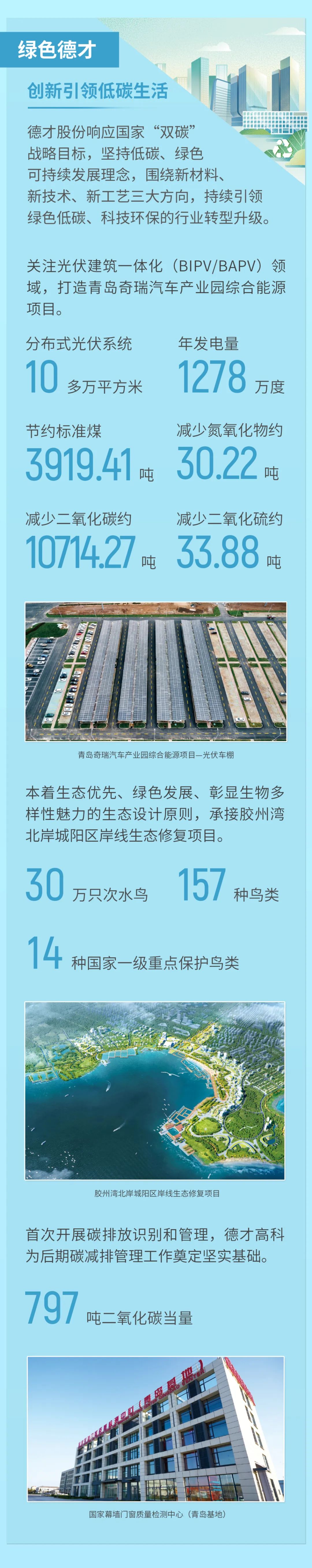 2023年6月5日是第52个世界环境日,德才股份积极承担企业责任,在今日正式发布2022年可持续发展报告,在以绿色为底色的中国式现代化画卷里描画着绿水青山。在环境保护方面,响应国家“双碳”战略目标,围绕新材料、新技术、新工艺,持续引领绿色低碳、科技环保的行业转型升级;在社会责任方面,聚焦医疗、教育、文化、乡村振兴等民生工程,以共建、共治、共享的价值观携手员工和供应商共同成长;在公司治理方面,以精益管理理念促进公司和利益相关方的协同发展和互惠共赢