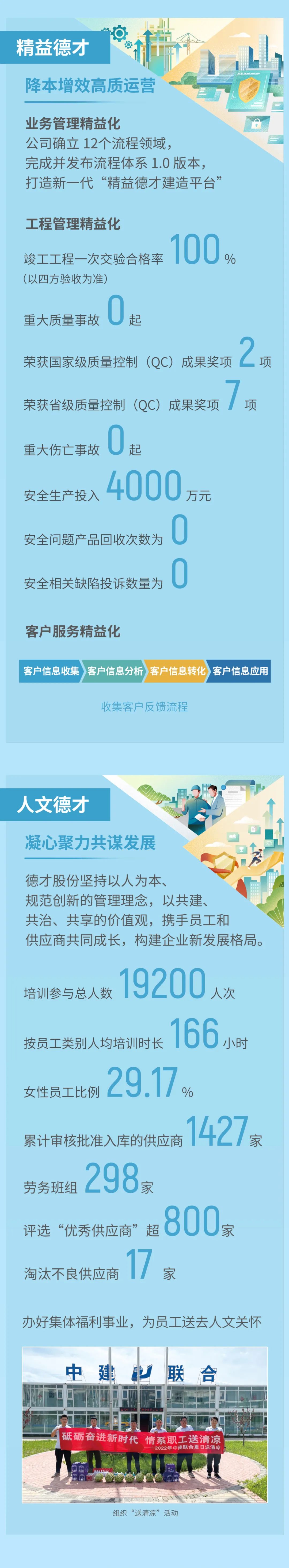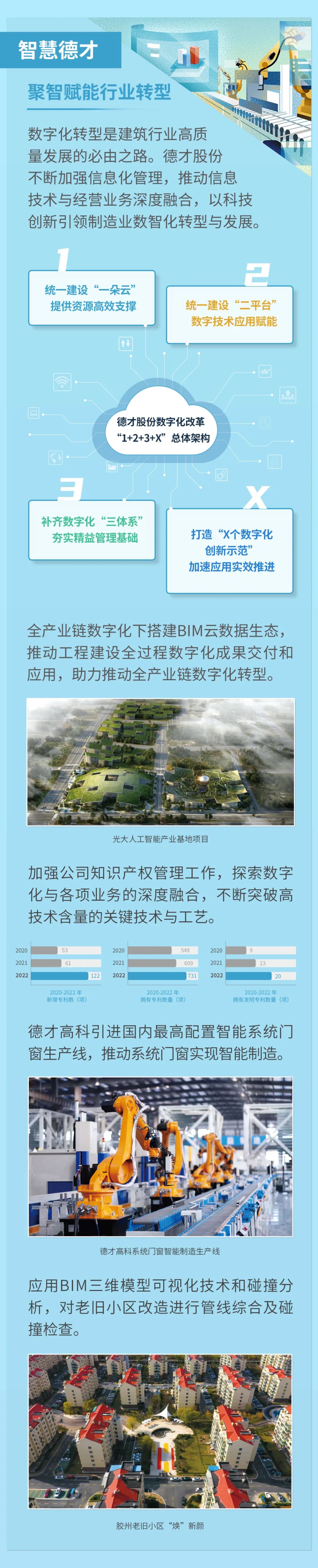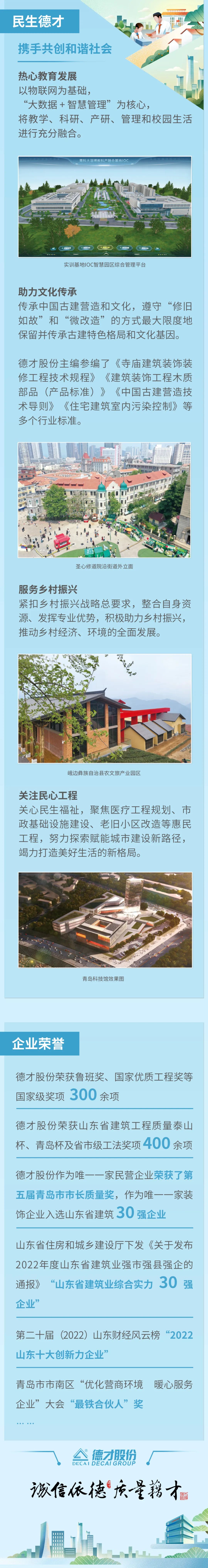 2023年6月5日是第52个世界环境日,德才股份积极承担企业责任,在今日正式发布2022年可持续发展报告,在以绿色为底色的中国式现代化画卷里描画着绿水青山。在环境保护方面,响应国家“双碳”战略目标,围绕新材料、新技术、新工艺,持续引领绿色低碳、科技环保的行业转型升级;在社会责任方面,聚焦医疗、教育、文化、乡村振兴等民生工程,以共建、共治、共享的价值观携手员工和供应商共同成长;在公司治理方面,以精益管理理念促进公司和利益相关方的协同发展和互惠共赢