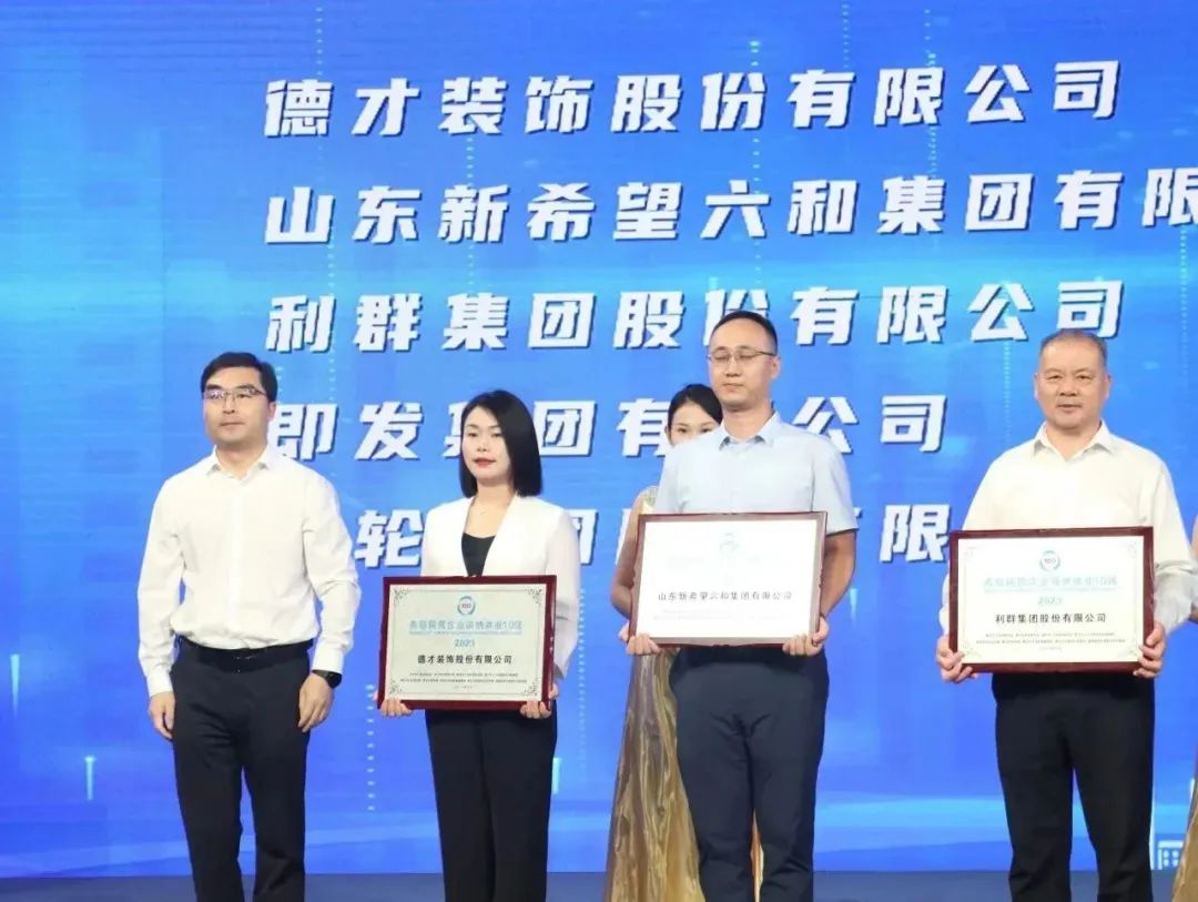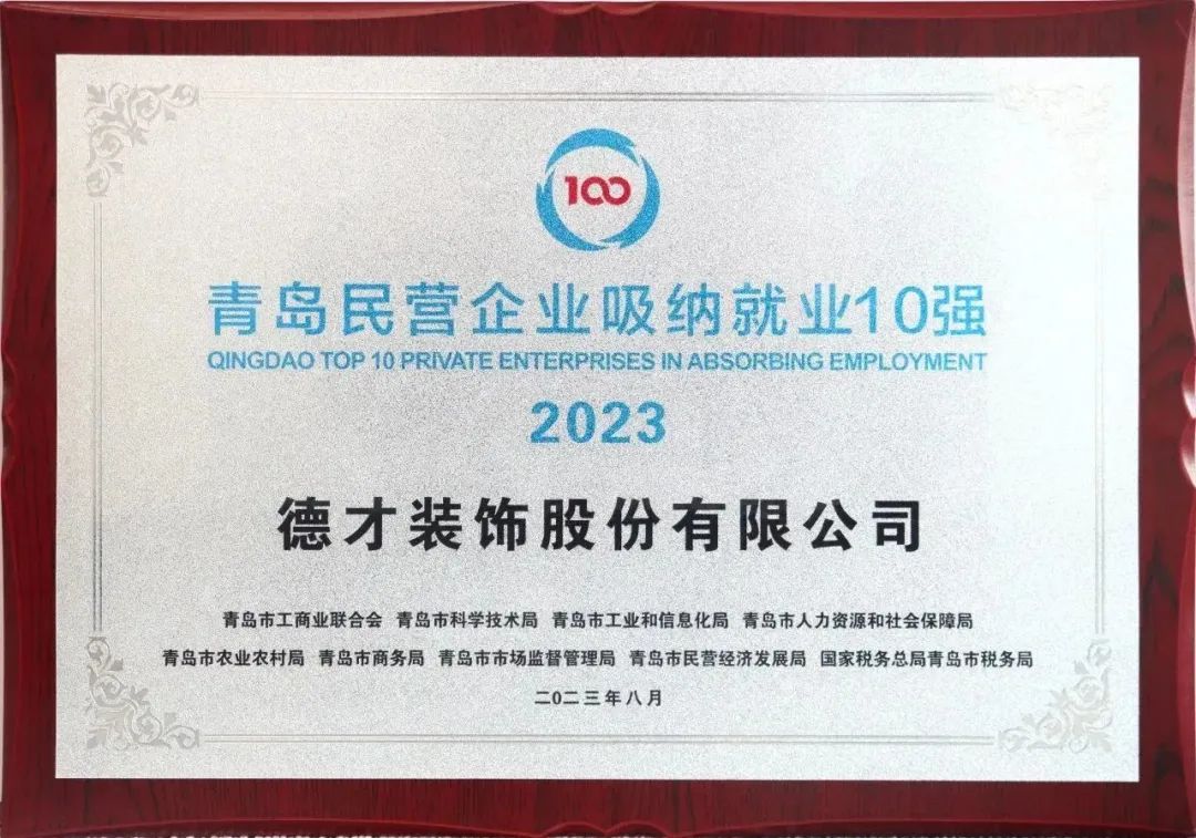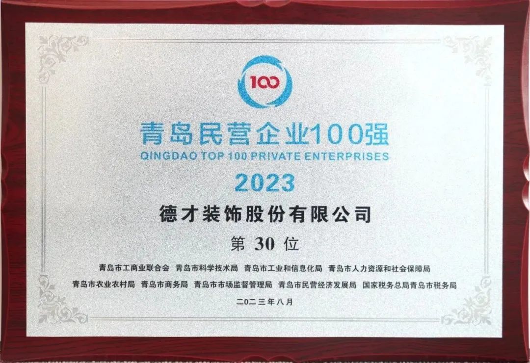 8月25日,青岛市工商联十四届三次常委(扩大)会议暨 2023 年青岛民营企业 100 强系列榜单发布会顺利召开,德才股份及旗下全资子公司——青岛中建联合集团有限公司双双登榜2022年青岛民营企业100强,德才股份荣登吸纳就业企业10强榜单,德才股份高管田会娜出席本次会议并接受颁奖。同时,在不久前由山东省工商联发布“2023山东民企100强”“吸纳就业100强”等系列榜单中,德才股份荣登“山东省民营企业吸纳就业100强”名单。