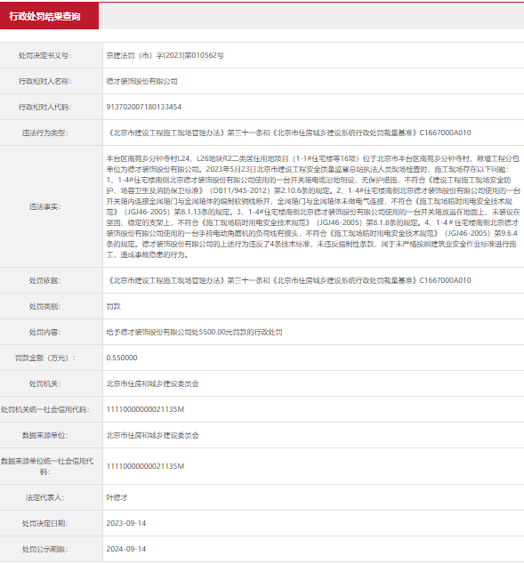 北京市住房和城乡建设委员会近期发布的消息显示,德才装饰股份有限公司(简称“德才股份”)被处罚,原因是未严格按照建筑业安全作业标准进行施工,造成事故隐患。