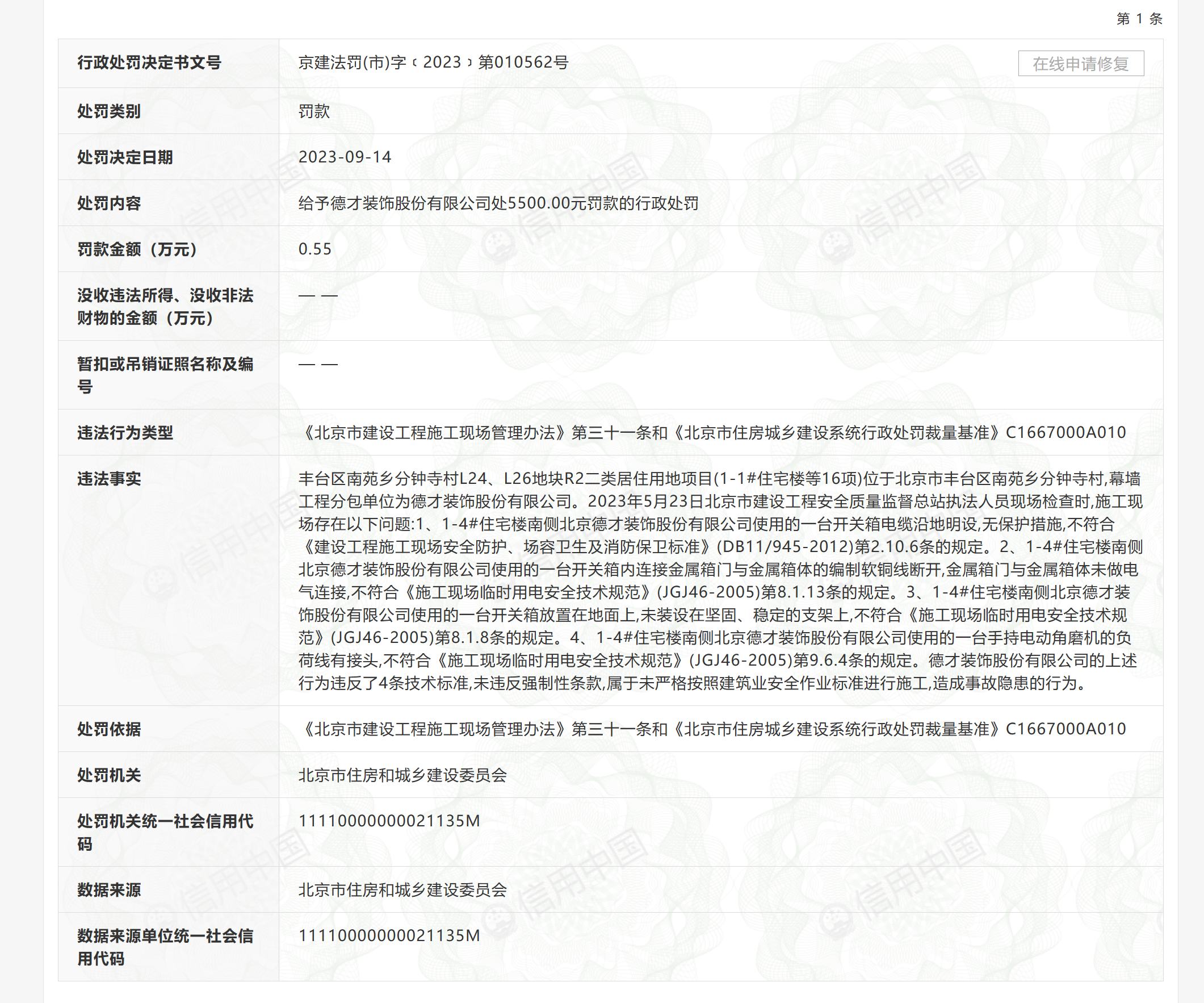 10月8日消息,德才装饰股份有限公司(以下简称“德才股份”)因违反《北京市建设工程施工现场管理办法》第三十一条和《北京市住房城乡建设系统行政处罚裁量基准》被行政处罚,处罚机关为北京市住房和城乡建设委员会。