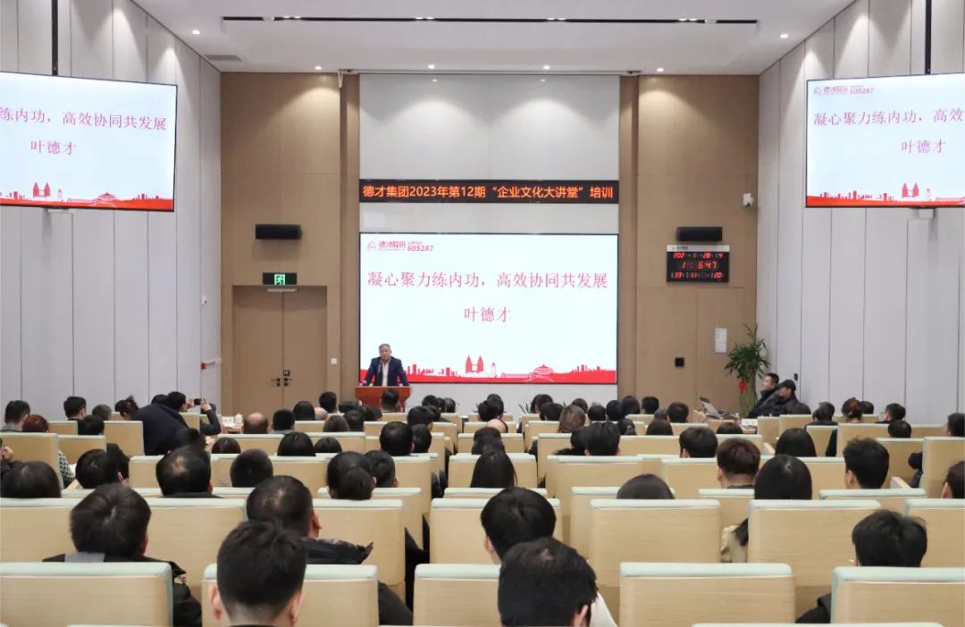 12月28日,德才股份2023年企业文化大讲堂第12期在德才大厦如期开讲。叶德才董事长以“凝心聚力练内功,高效协同共发展”为主题发表讲话,号召全体德才员工凝聚共识、坚定信心,建立高效协同的组织形态,在新一轮经济发展浪潮中争当领跑者、先行者。