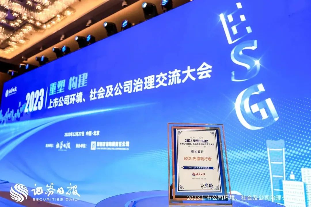12月27日,由证券日报主办的“2023上市公司环境、社会及公司治理交流大会”(2023 ESG发展论坛)在北京召开。会上,公布了2023年ESG先锋践行者案例获奖名单,德才股份获评“ESG先锋践行者”。