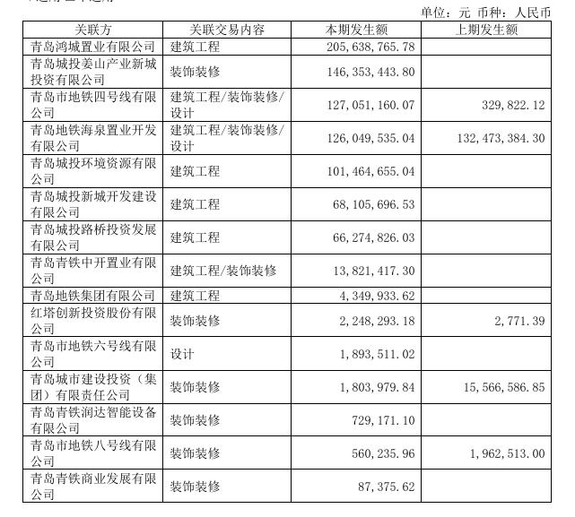 德才装饰2022年年报中显示,青岛地铁集团及其子公司和德才装饰的合同金额为2.86亿元,其中,青岛地铁海泉置业公司与德才装饰的交易额为1.26亿元,2021年的交易金额为1.32亿元。