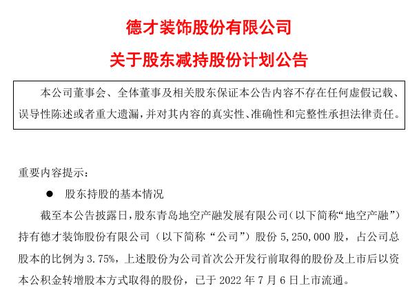 4月1日,德才股份(605287)发布股东减持股份计划公告,称青岛地铁集团有限公司(下称“青岛地铁集团”)全资子公司青岛地空产融发展有限公司计划减持公司股份合计不超过420万股,减持比例不超过公司总股本的3%。