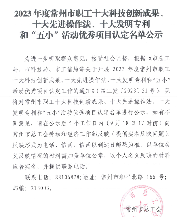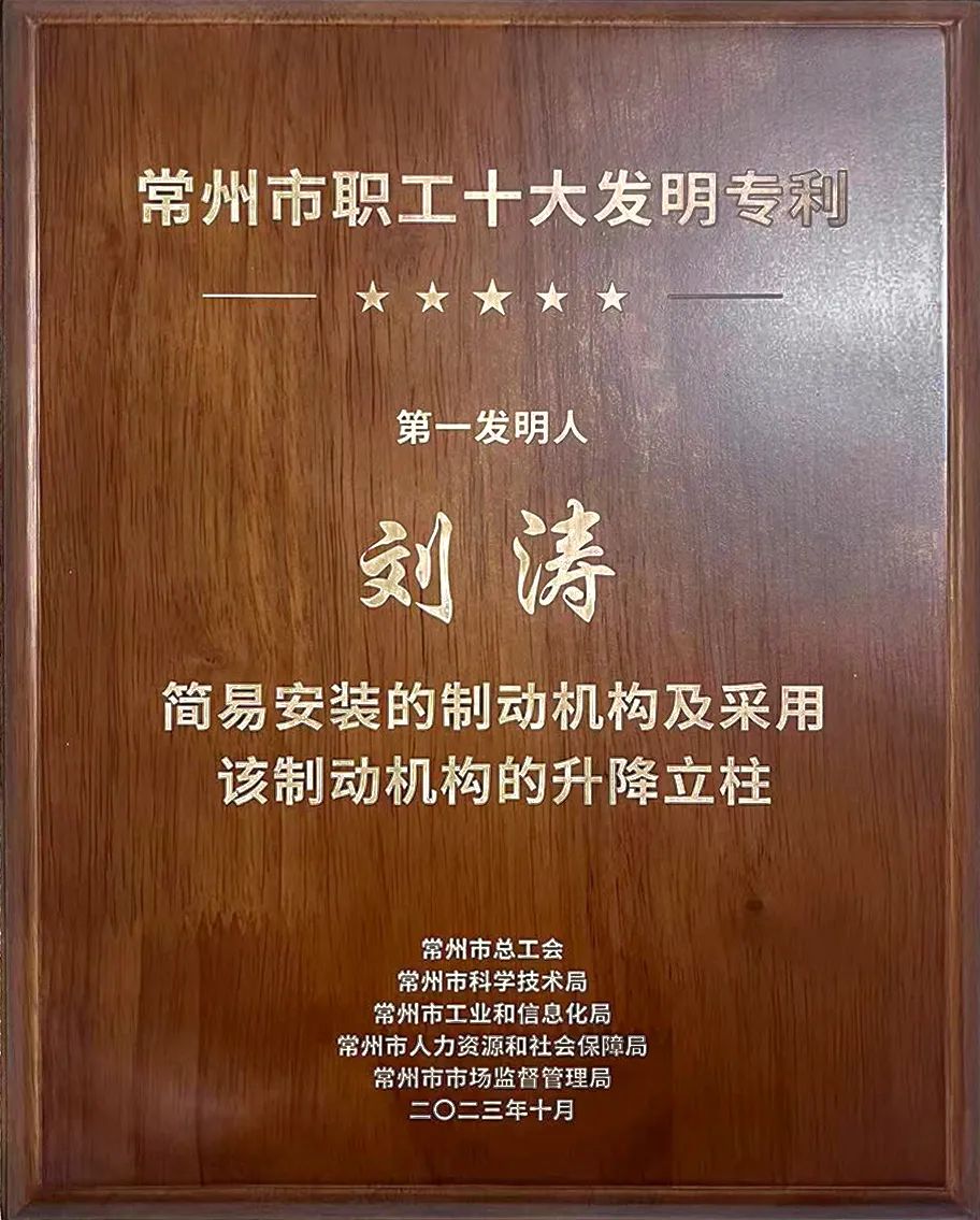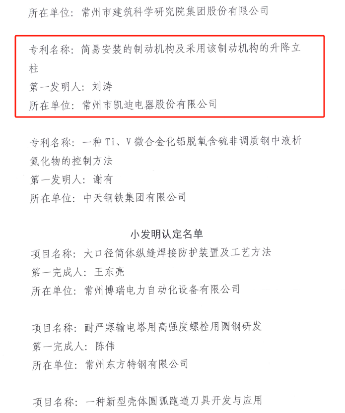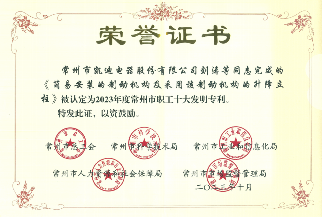 据悉,根据《市总工会、市科技局、市工信局等关于开展2023年度常州市职工十大科技创新成果、十大先进操作法、十大发明专利和“五小”活动优秀项目认定工作的通知》(常工发〔2023〕51号)最终评审决定,由凯迪股份刘涛等职工完成的《简易安装的制动机构及采用该制动机构的升降立柱》发明成果,被认定为“常州市职工十大发明专利”。