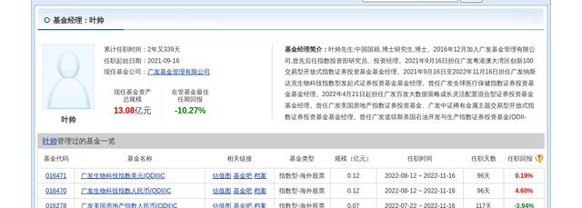 简历显示,叶帅先生:中国国籍,博士研究生,博士。2016年12月加入广发基金管理有限公司,曾先后任指数投资部研究员、投资经理。2021年9月16日担任广发粤港澳大湾区创新100交易型开放式指数证券投资基金基金经理。2021年9月16日至2022年11月16日担任广发纳斯达克生物科技指数型发起式证券投资基金基金经理。曾任广发全球医疗保健指数证券投资基金基金经理。2022年4月21日起担任广发百发大数据策略成长灵活配置混合型证券投资基金基金经理。曾任广发美国房地产指数证券投资基金、广发中证稀有金属主题交易型开放式指数证券投资基金基金经理。曾任广发道琼斯美国石油开发与生产指数证券投资基金(QDII-LOF)基金经理。