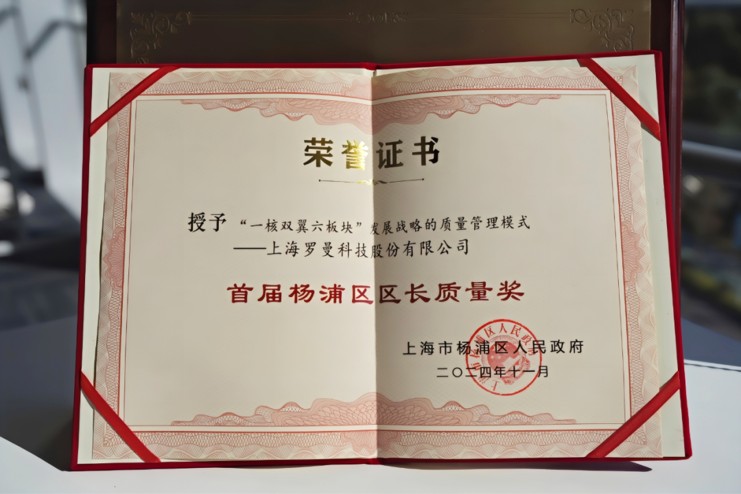 “杨浦区区长质量奖”是本区最高质量荣誉,主要表彰质量管理水平卓越、创新性、示范性、推广性处于全市和本区同行业内领先地位的先进质量管理模式,以及对促进本区经济社会高质量发展作出突出贡献的先进质量管理成果。经资格审查、资料评审、现场评审、综合评价等环节,罗曼股份“一核双翼六板块”发展战略的质量管理模式荣获“杨浦区区长质量奖”。