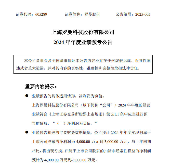 1月16日,罗曼股份(605289.SH)发布2024年年度业绩预亏公告。