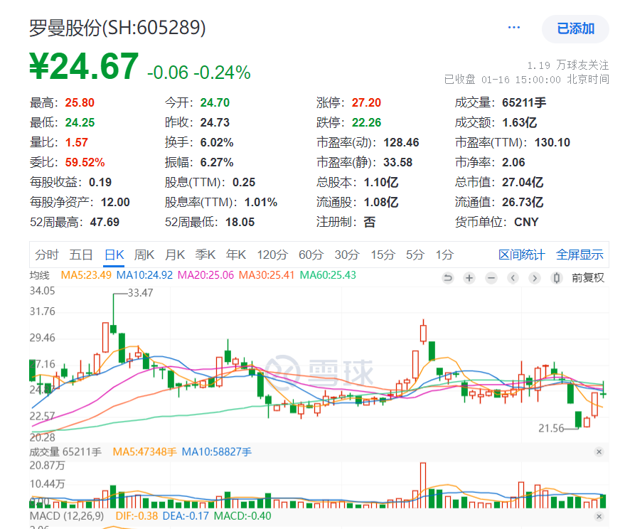 截至1月16日收盘,罗曼股份股价跌0.24%,报24.67元,总市值为27.04亿元。