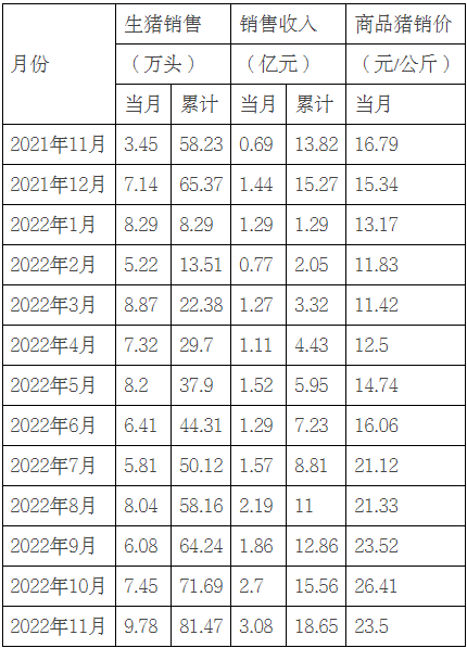 2022年11月份,公司销售生猪9.78万头(其中商品猪销售9.63万头),销售收入3.08亿元。其中向集团内部屠宰企业销售生猪1.70万头。