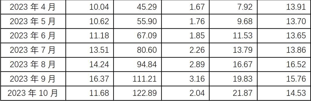 2023年10月份,公司销售生猪11.68万头(其中商品猪销售11.40万头),销售收入2.04亿元。其中向集团内部屠宰企业销售生猪2.16万头。