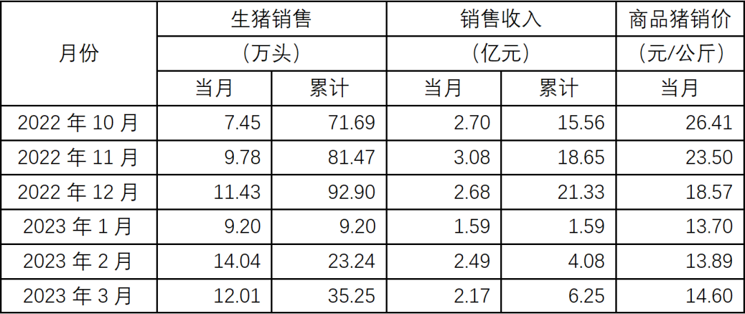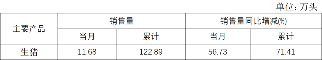 2023年1-10月,公司共销售生猪122.89万头(其中商品猪120.49万头),销售收入21.87亿元。其中向集团内部屠宰企业销售生猪27.19万头。