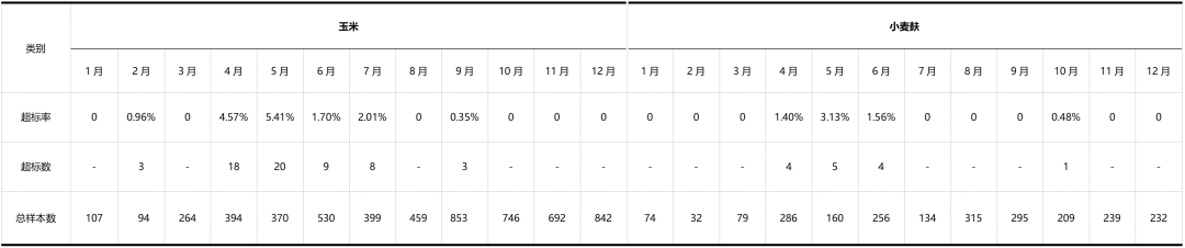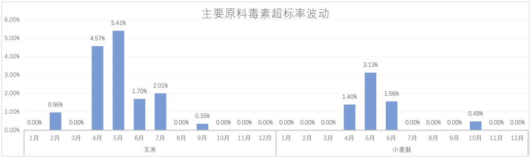2024年,玉米毒素超标率为1.25%,超标时段主要集中于2、3季度,其中二季度最为严重,超标样品多为教保专用玉米。小麦麸毒素超标率为0.55%,超标时段主要集中于2季度,超标样品中中最高值为4813.7μg/kg。