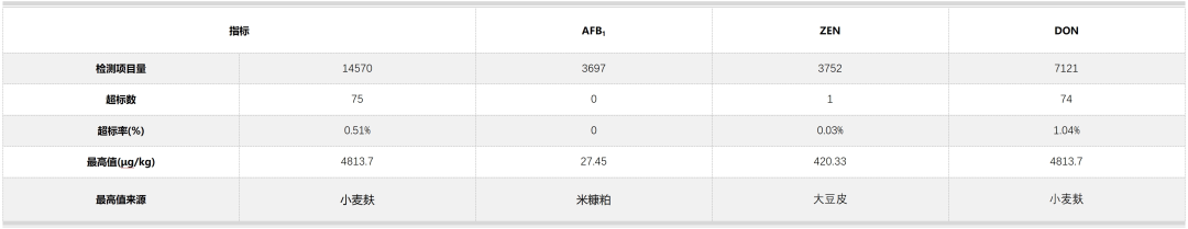 注:样品由神农集团各分子公司品管部实验室通过定量和定性进行到厂毒素检测,对检测结果在限量值附近或疑似超标的样品由集团中心化验室进行验证。