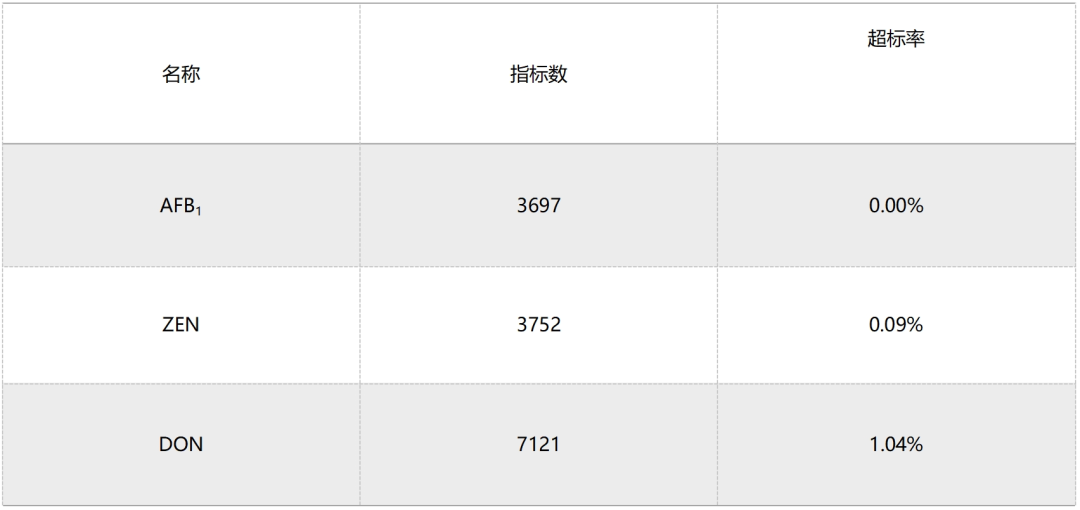 三种霉菌毒素限量标准见表3样品毒素含量超过最高限量值,即判定为超标样。